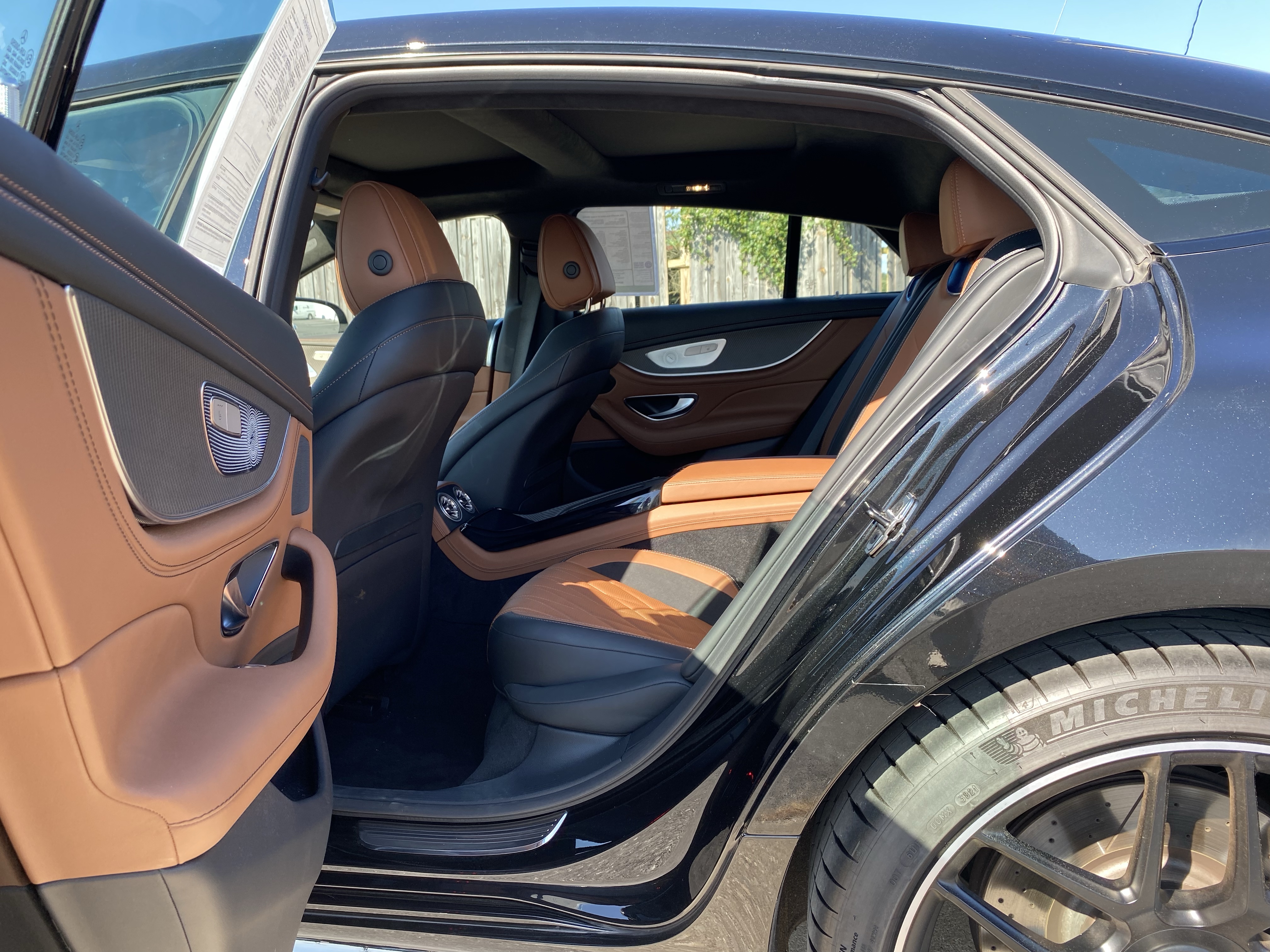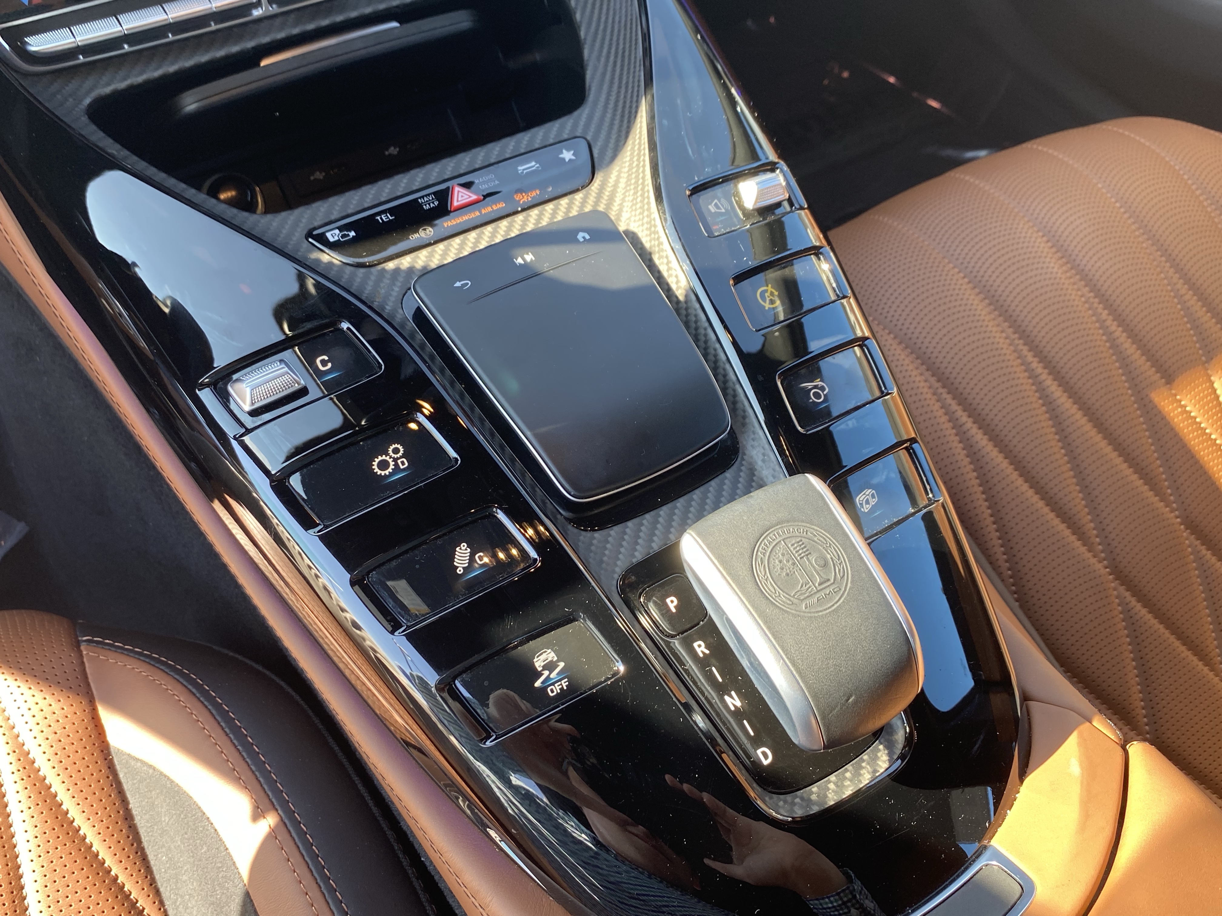 Okay, it is later. There is a lot of AMG badging in this interior. I tried to count but lost track at around 8 different places excluding the AMG tree emblem found on places like the gear shifter. The interior of the GT53 is an exquisite place to be. It is a sea of perfectly stitched leather and premium metals. Every surface I touched felt better than the last in this car. While not my favorite, the brown leather looks better in the flesh than in pictures and is as comfortable as any other Mercedes I have sat in. Strangely, the AMG GT models feature a completely different gear shifter setup than the regular column shifter that most Mercs have. The rear seats have the optional captain seats with this divider running through the middle housing a second center console and a screen with many different functions on it. Rear legroom is more premium economy than business class, but the upside of having our own seat dilutes how much space your legs get.