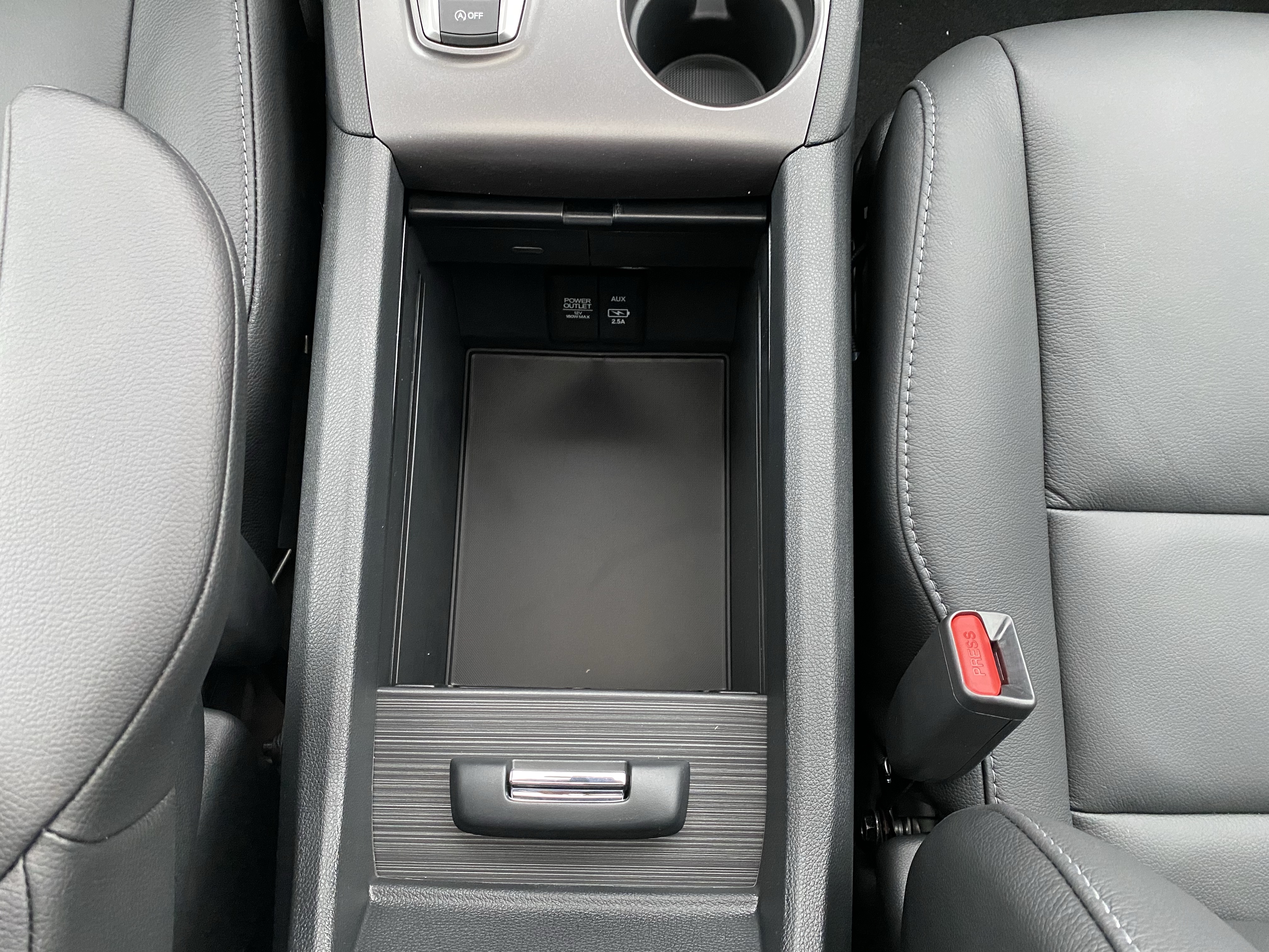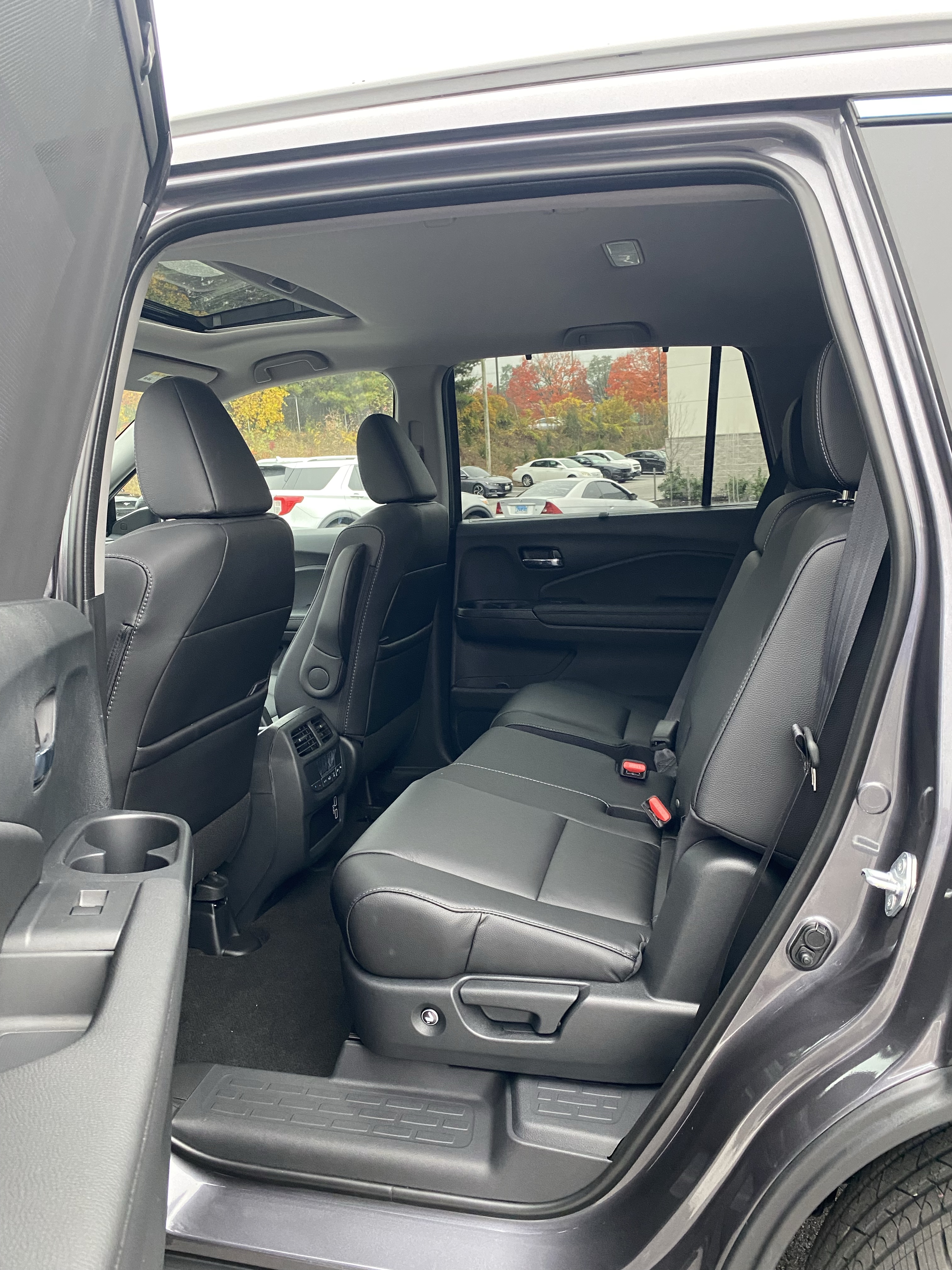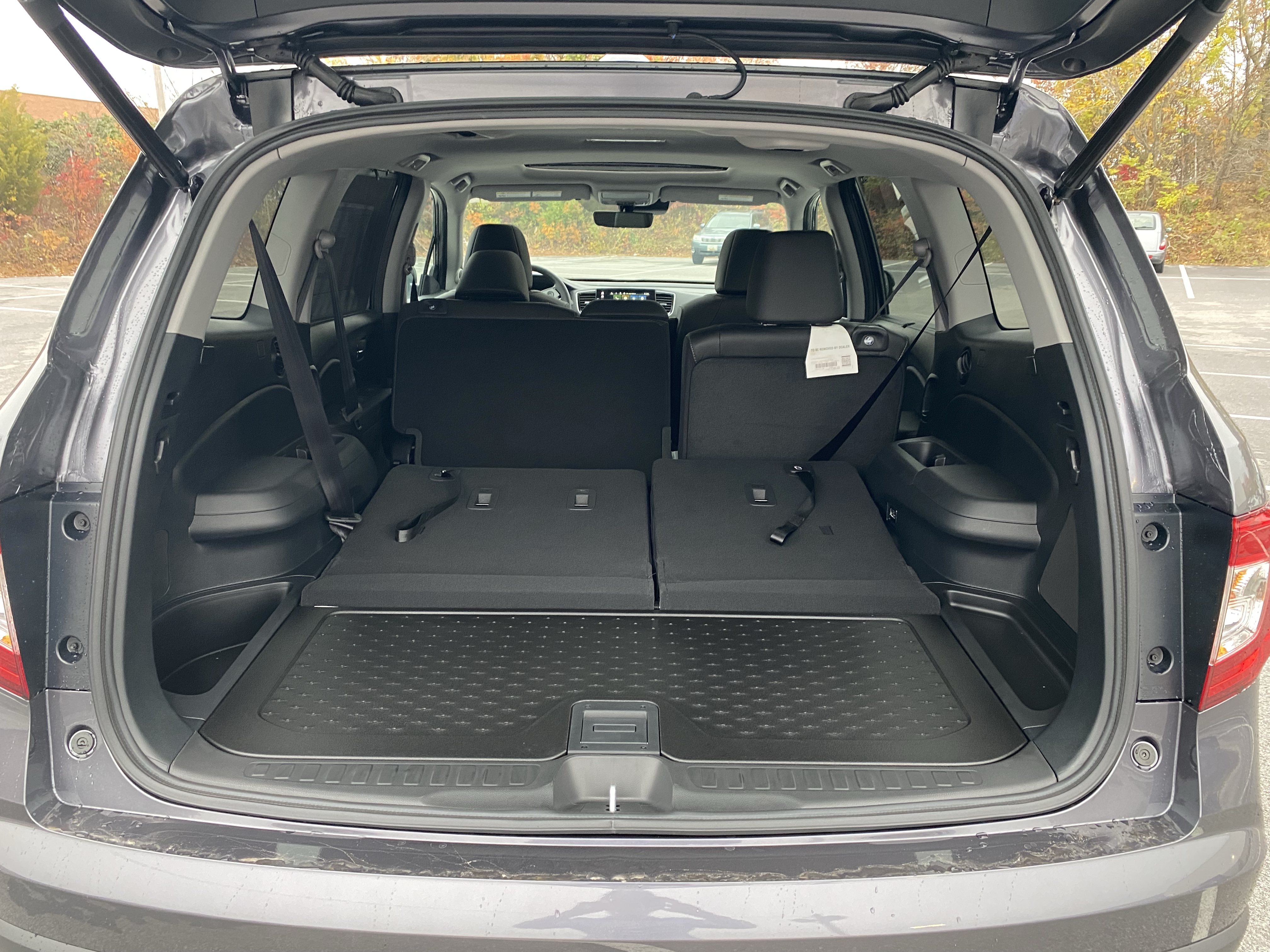 The interior of the Pilot is your standard Honda SUV fare. Like the Passport I drove earlier this year, one of the main features present in the Pilot is the absolutely cavernous center console. Seriously, this is Suburban levels of massive. That being said, the center console is much lower than the seats themselves, making it difficult to do a quick reach-in or coffee cup grab while you’re driving, let alone not being able to rest your arm on it. Honda has solved the latter issue by putting manual armrests on their front seats, but they aren’t very supportive and feel like an afterthought. Aside from the center console, not much in this interior needs tough scrutinization. The trim pieces all line up and feel solid to the touch, the steering wheel has a nice leather-esque feel, and you even get a sunglass holder – something I haven’t seen in a while. As for rear seat passengers, there is more than ample rear seat room even with the front seats pushed back far. This is most likely due to the Pilot’s small hood, giving the cabin more space than some of its competitors. Third-row access is done by pressing a button on the seat and manually sliding it forward, giving you enough room to sit in the good enough third row. Listen, I was spoiled by the Suburban. Nothing will beat the Suburban. Impressively, with the third-row seats up, you still have enough room in the back for a decent amount of groceries and you even have the ability to access more storage space as well by removing a part of the floor in the way back.