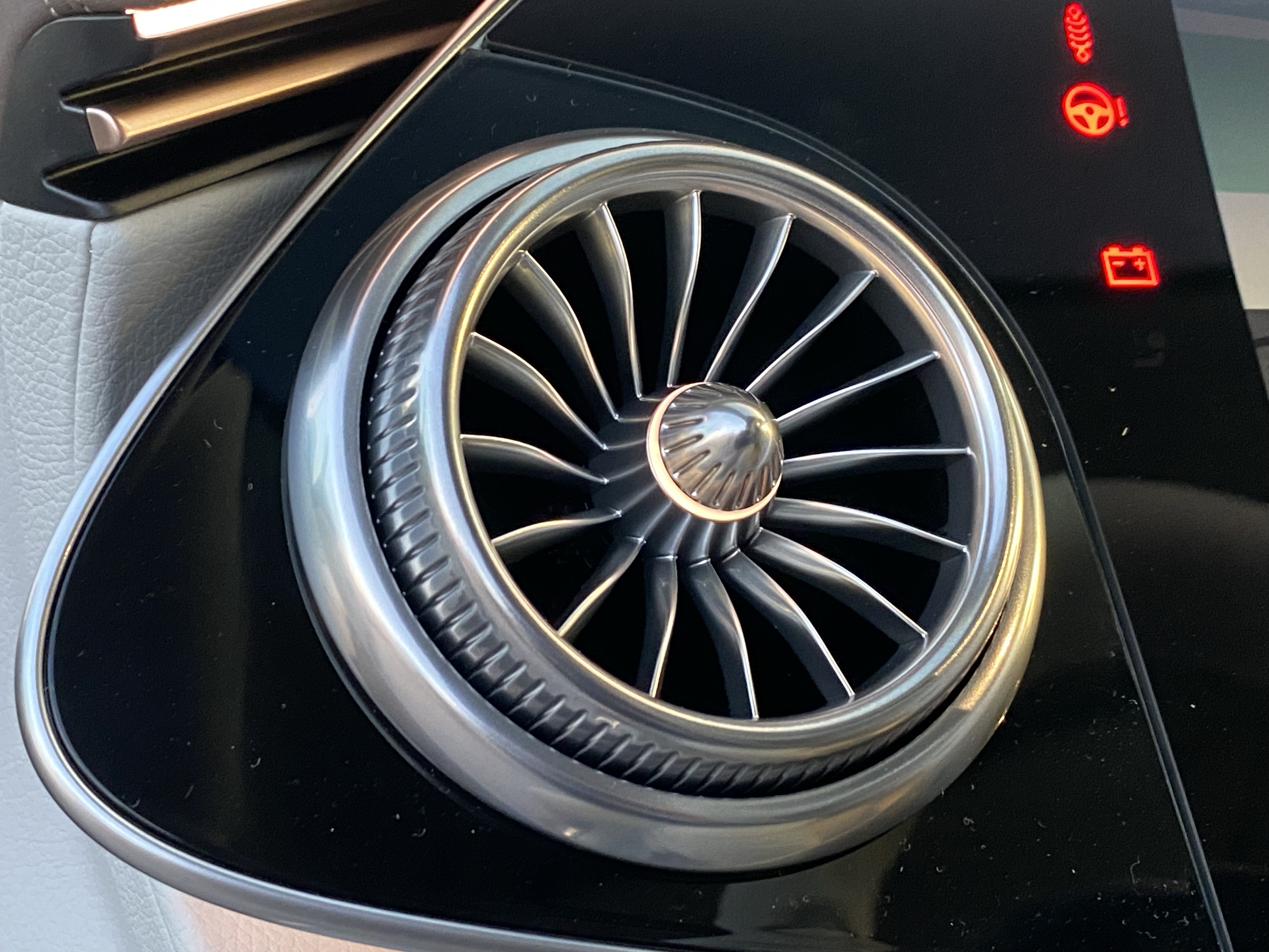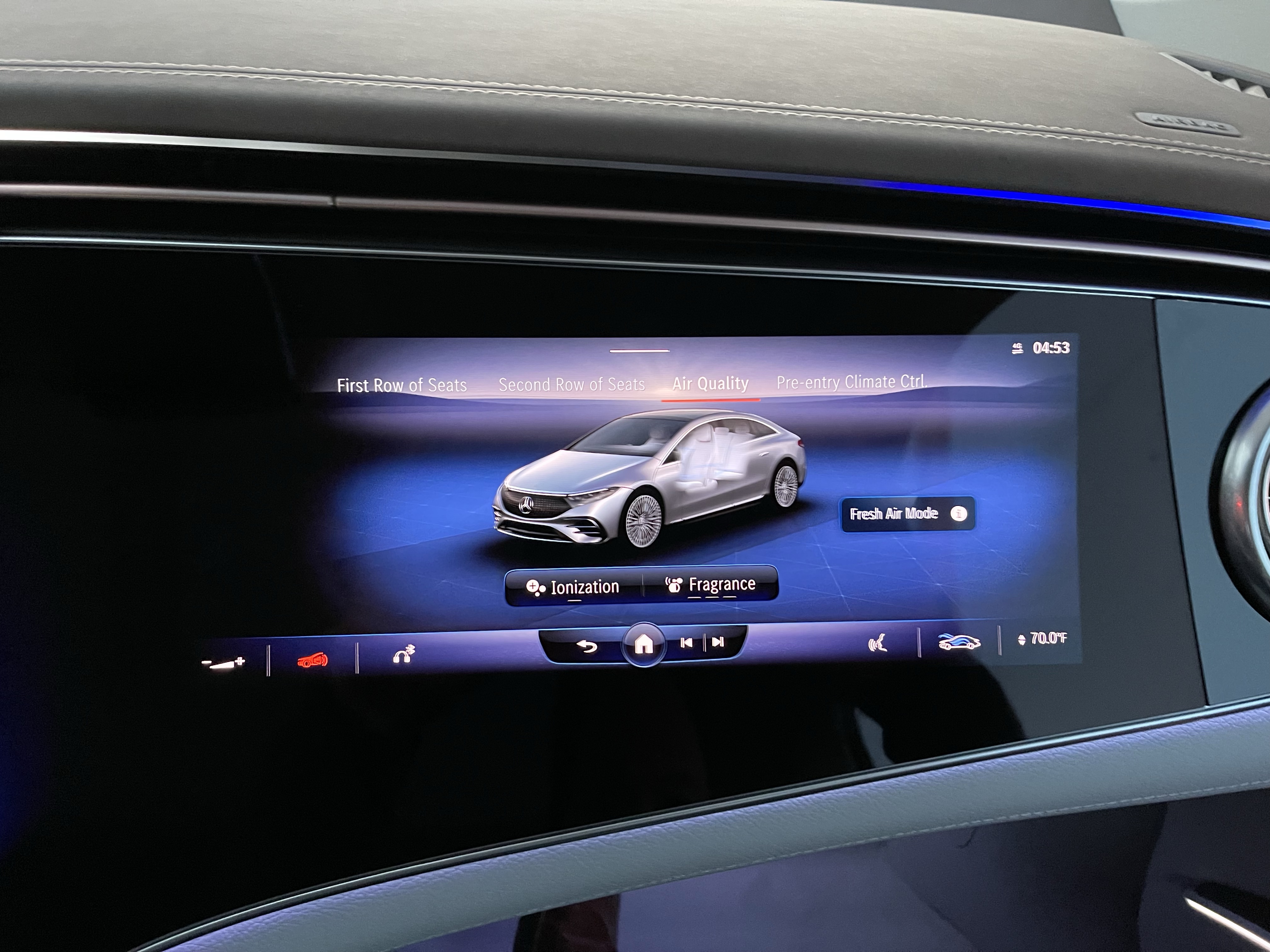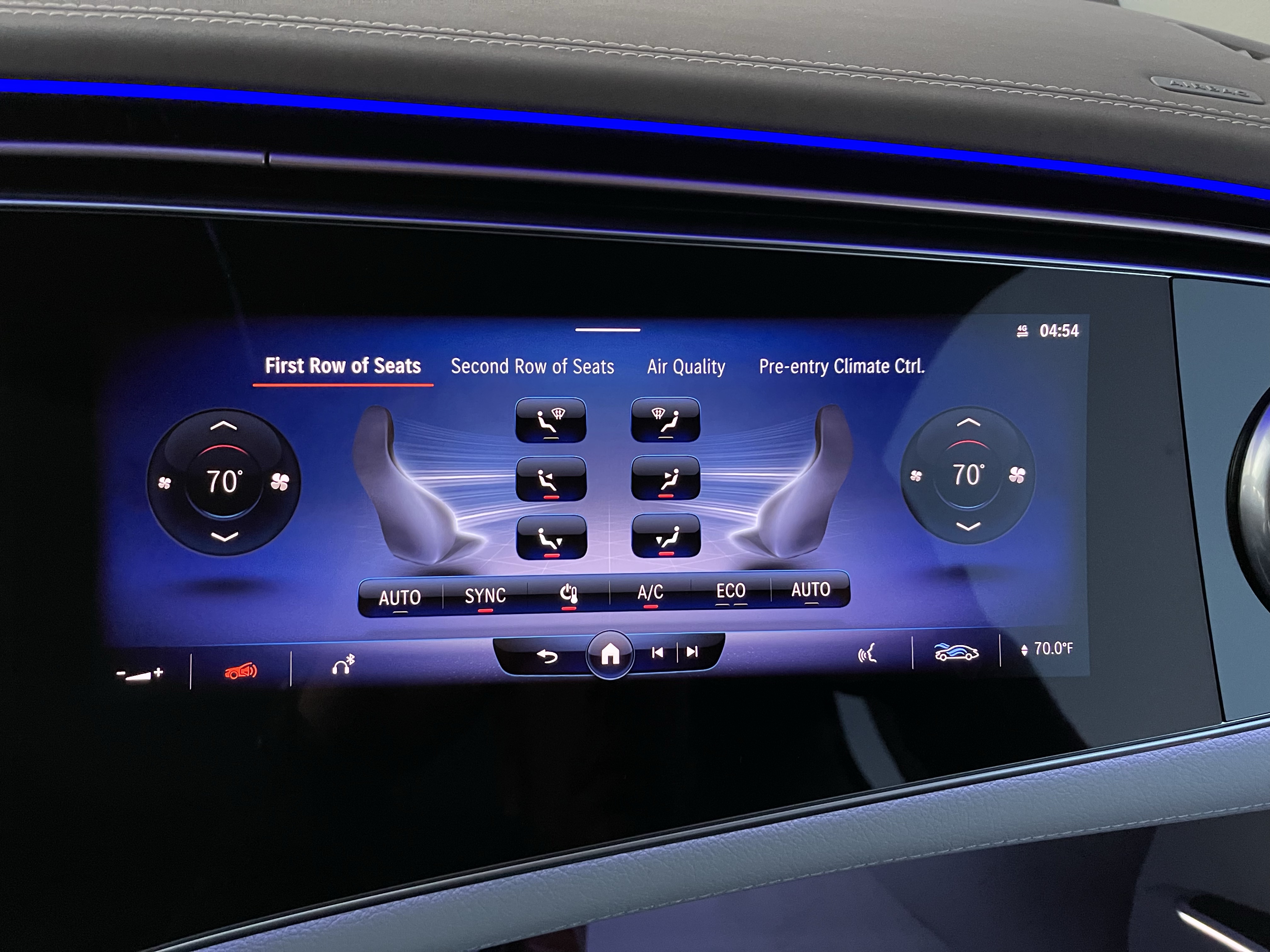 As for the functionality of the main screen itself along with the driver’s display, it is exactly the same as on every other Mercedes model. Great to use, easy to navigate, and infinitely configurable. However, because of the hyperscreens size, the buttons that are placed at the bottom of the regular screen have moved right below the center console which means you will hit the fingerprint sensor every time you put your arm on the armrest and that is very annoying. With the semi-annoying control placements, you also get some nice luxury features such as heated and cooled front seats with a massage feature, heated rear seats, a heated steering wheel, adaptive cruise control, haptic touch buttons, a tri-zone climate system MercedesMe which is also annoying, a Burmester Soundsystem, a 360 surround-view camera system, power moonroof, wireless charging, USB-C and A ports, and finally the standard Bluetooth with CarPlay. And yes, while all of these are great: none of them are better than the spaceship noises. Yes: spaceship noises.