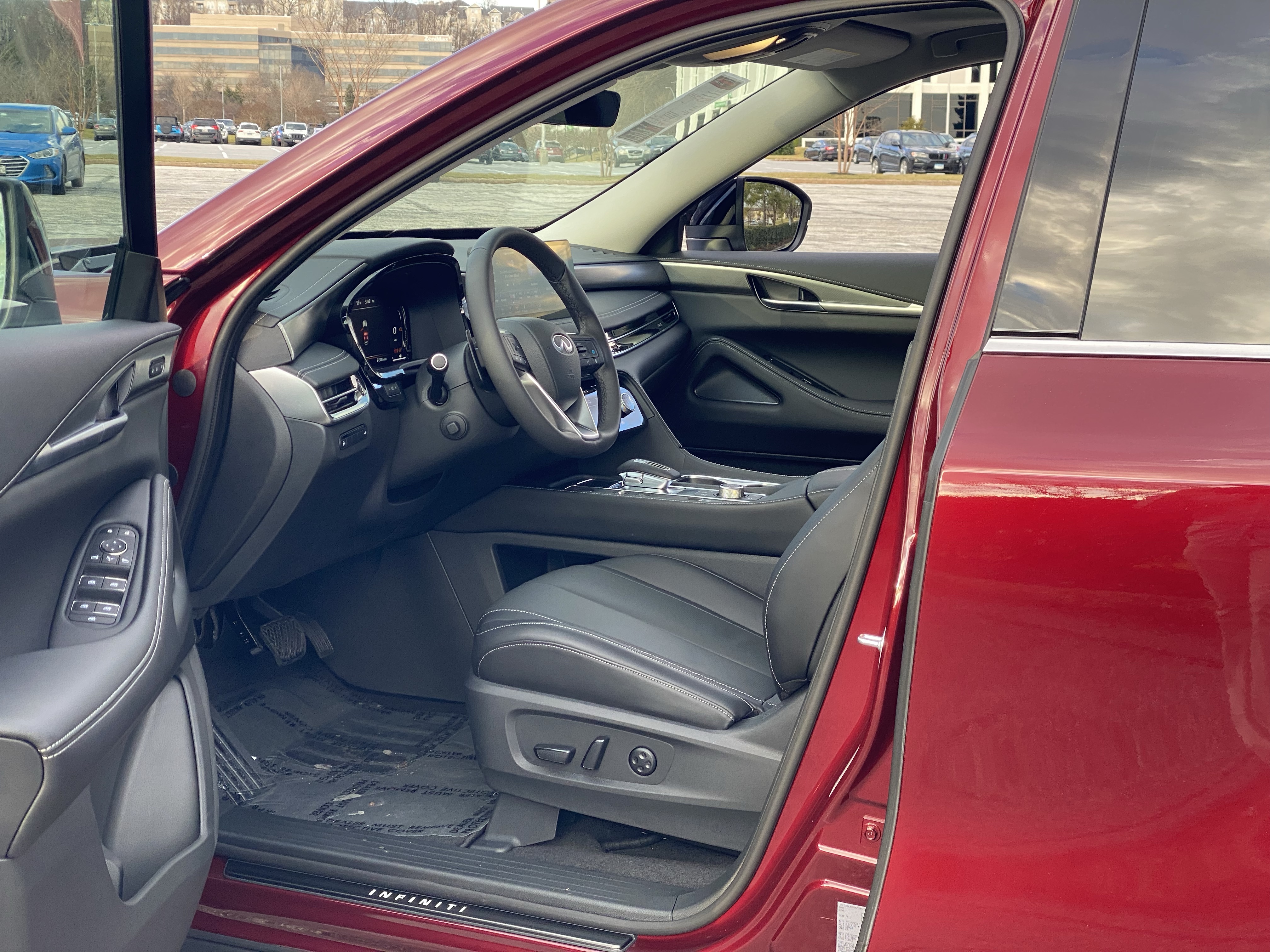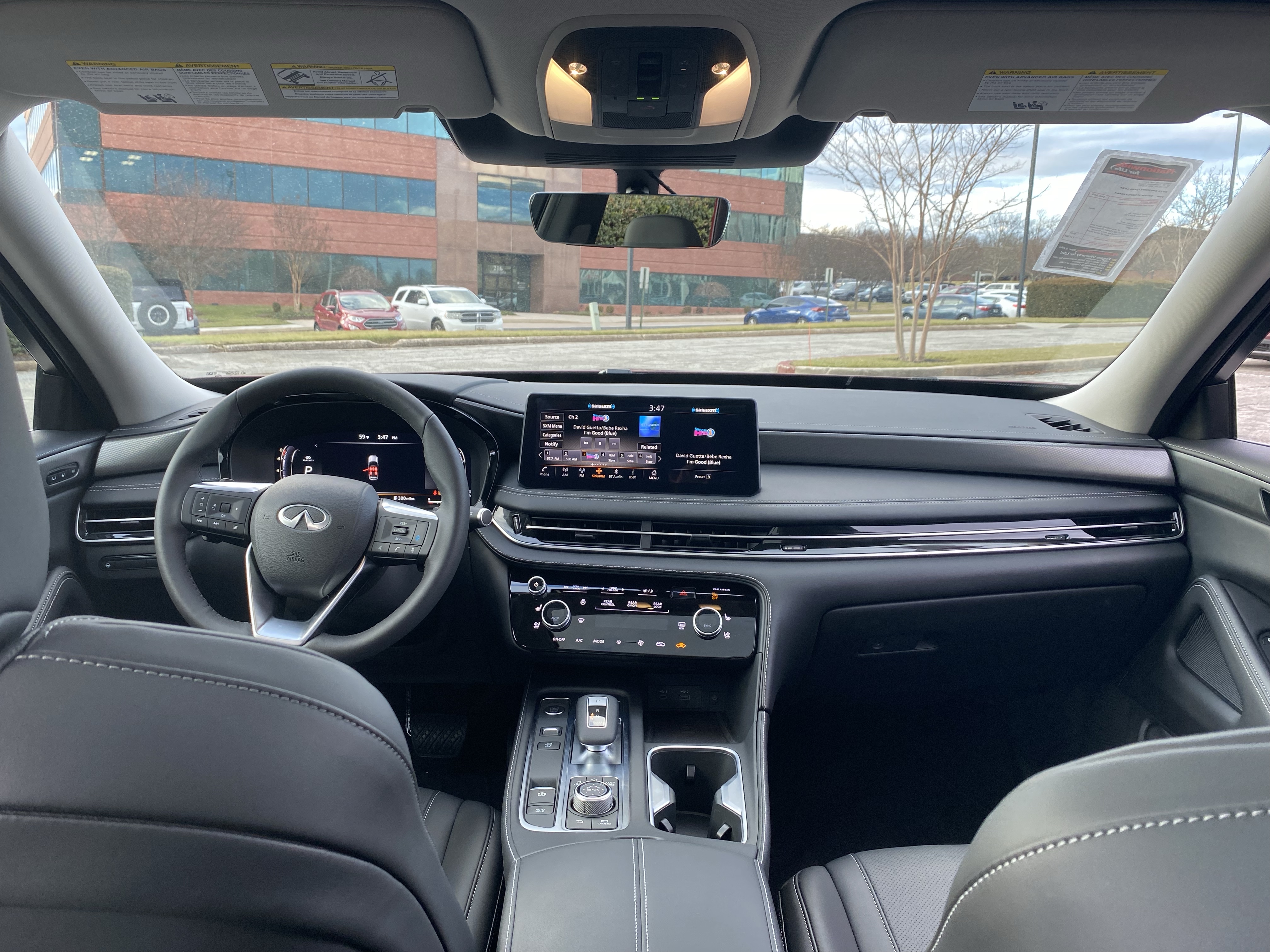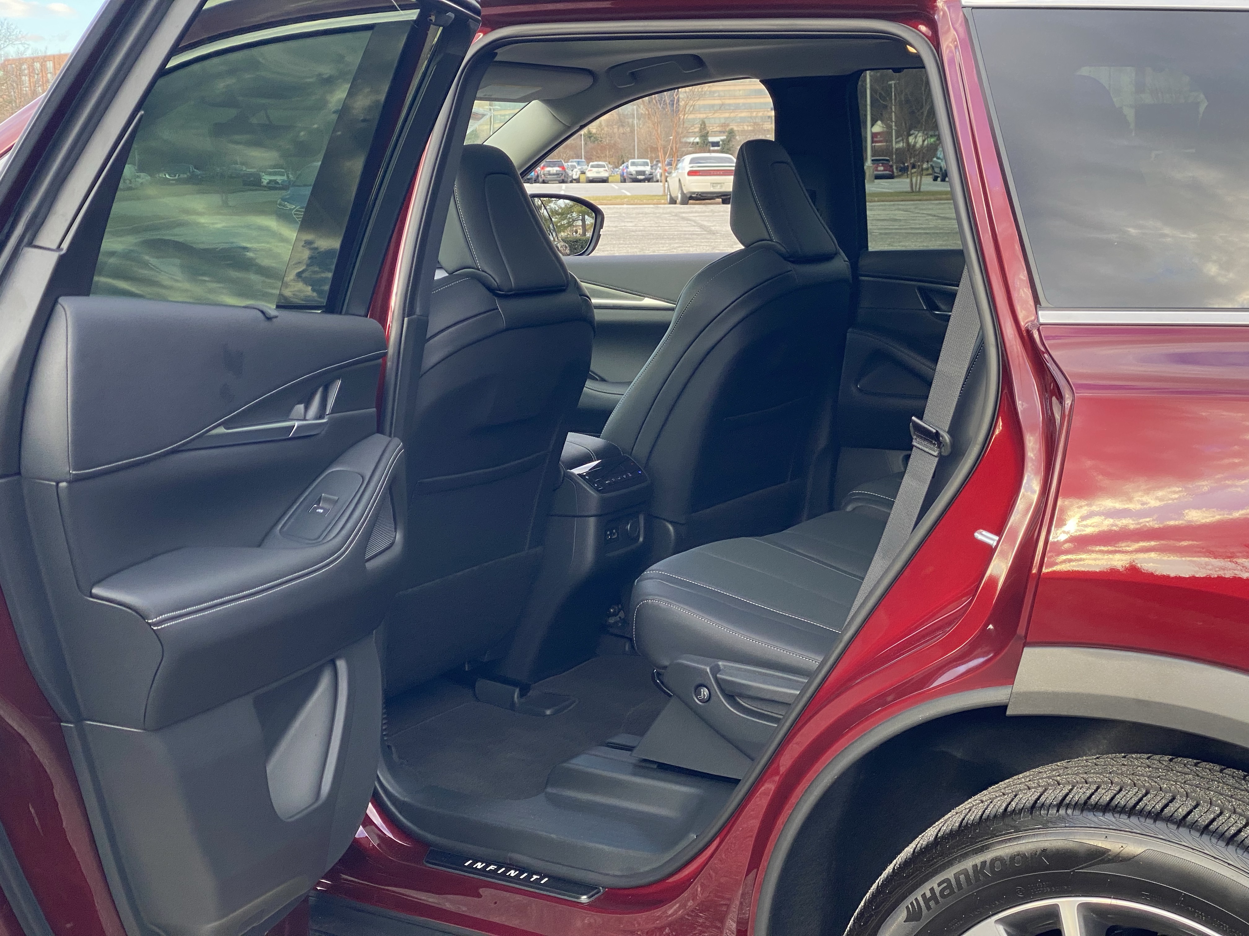 Now we get to the best part of the QX60: the interior. This isn’t just good by Infiniti standards, this is good on a global level. It isn’t fantastic or class-leading, the Acura MDX has a much better-looking and feeling interior, but this is still a nice place to be. Like the exterior, the interior is also bespoke to the QX60, with the exception of the center console and driver’s display screen. Aside from that, the dashboard, controls, and even the air vents are different than what you’d find on the Pathfinder. The materials in this car are expected for the price. The one I drove, the Lux, is the base model, so there are some plastic trim pieces that can be replaced when upping your model. It isn’t all bad news, however. The seats are very lovely and the contrast stitching does a lot to elevate the cabin. The rear seat room is also not “class-leading” but is more than enough for someone over 6 feet. However, the third row is not. Find me a third row in a midsized crossover I can fit in and I’ll dance naked through Times Square.
