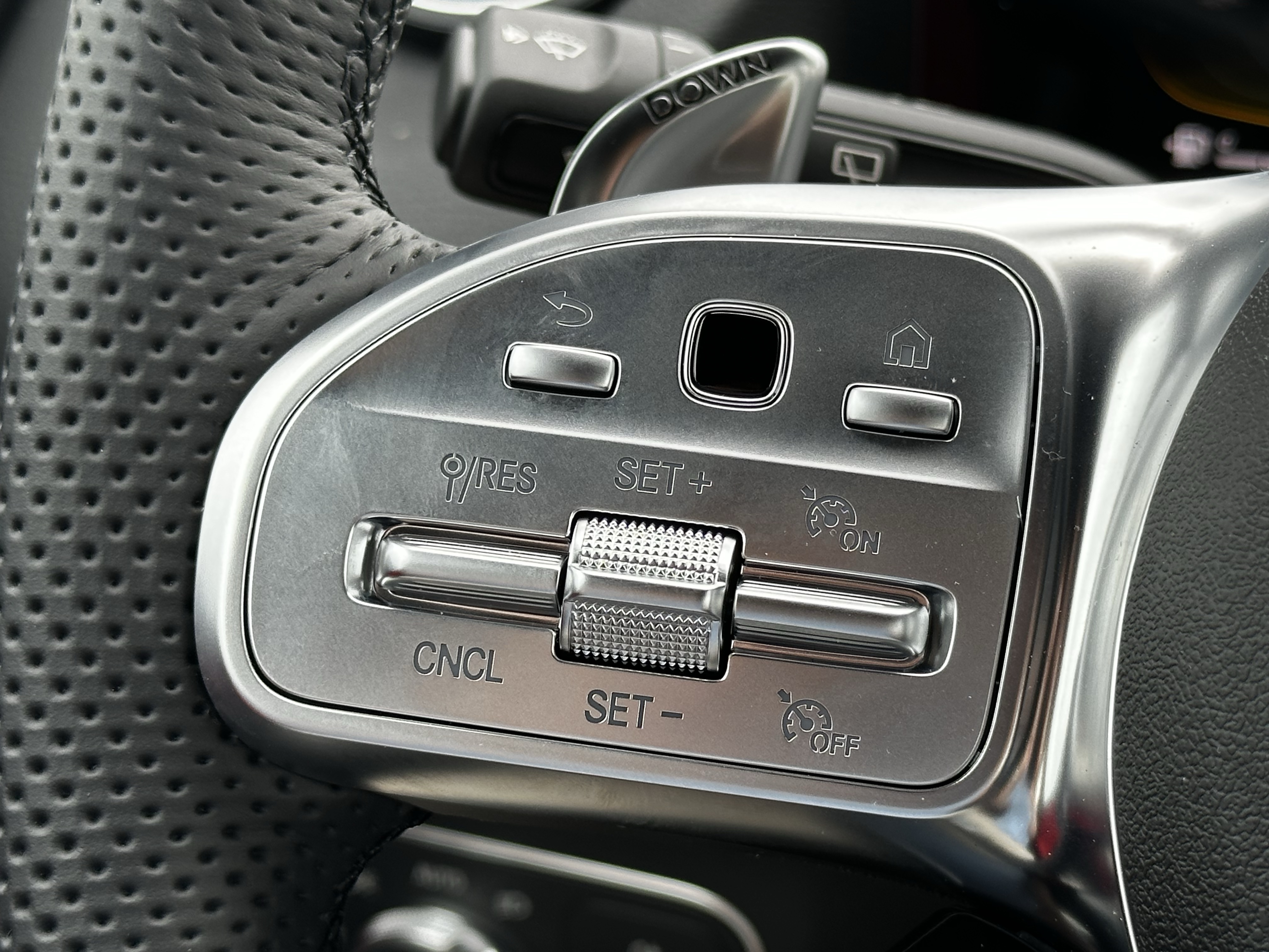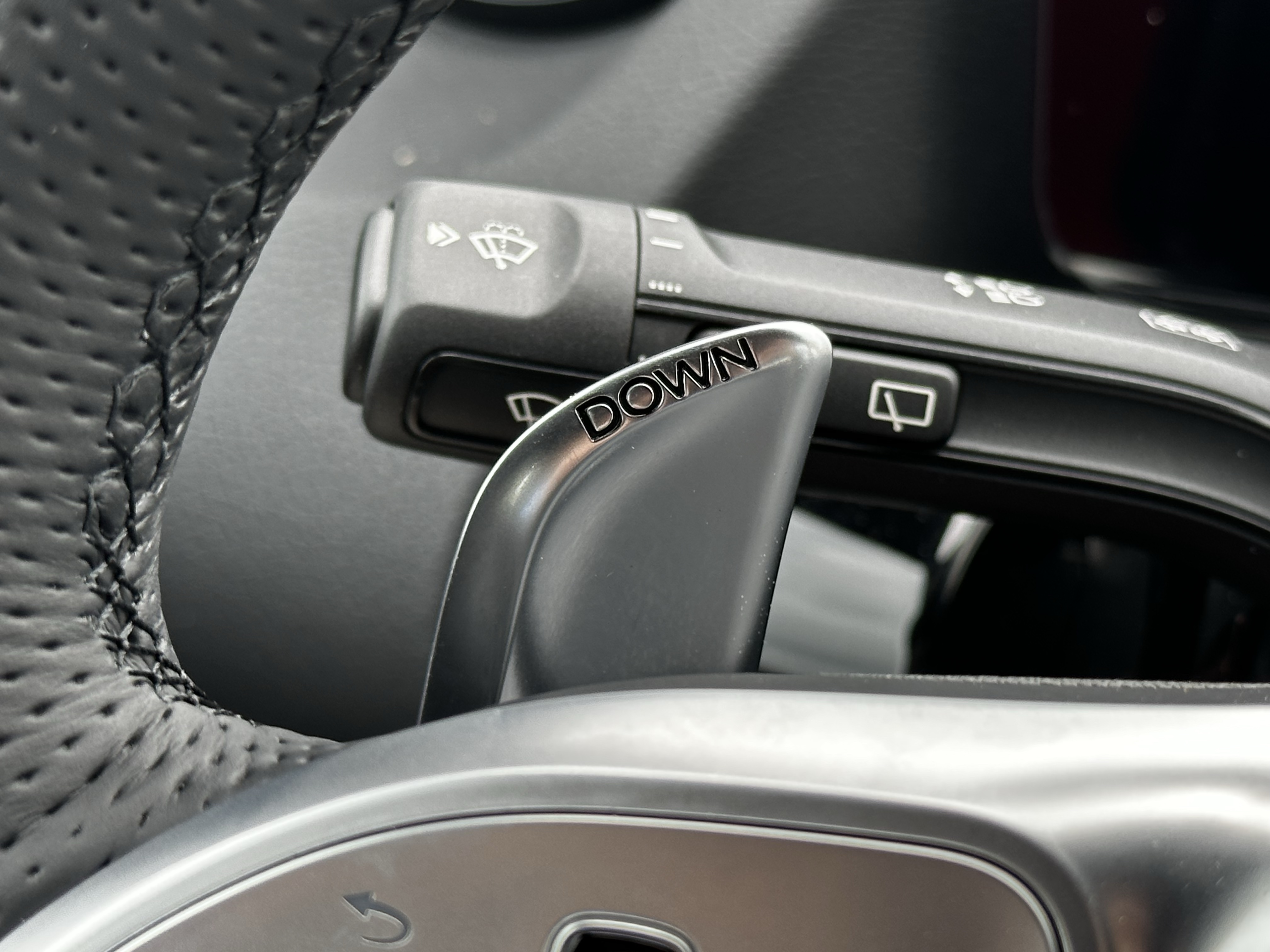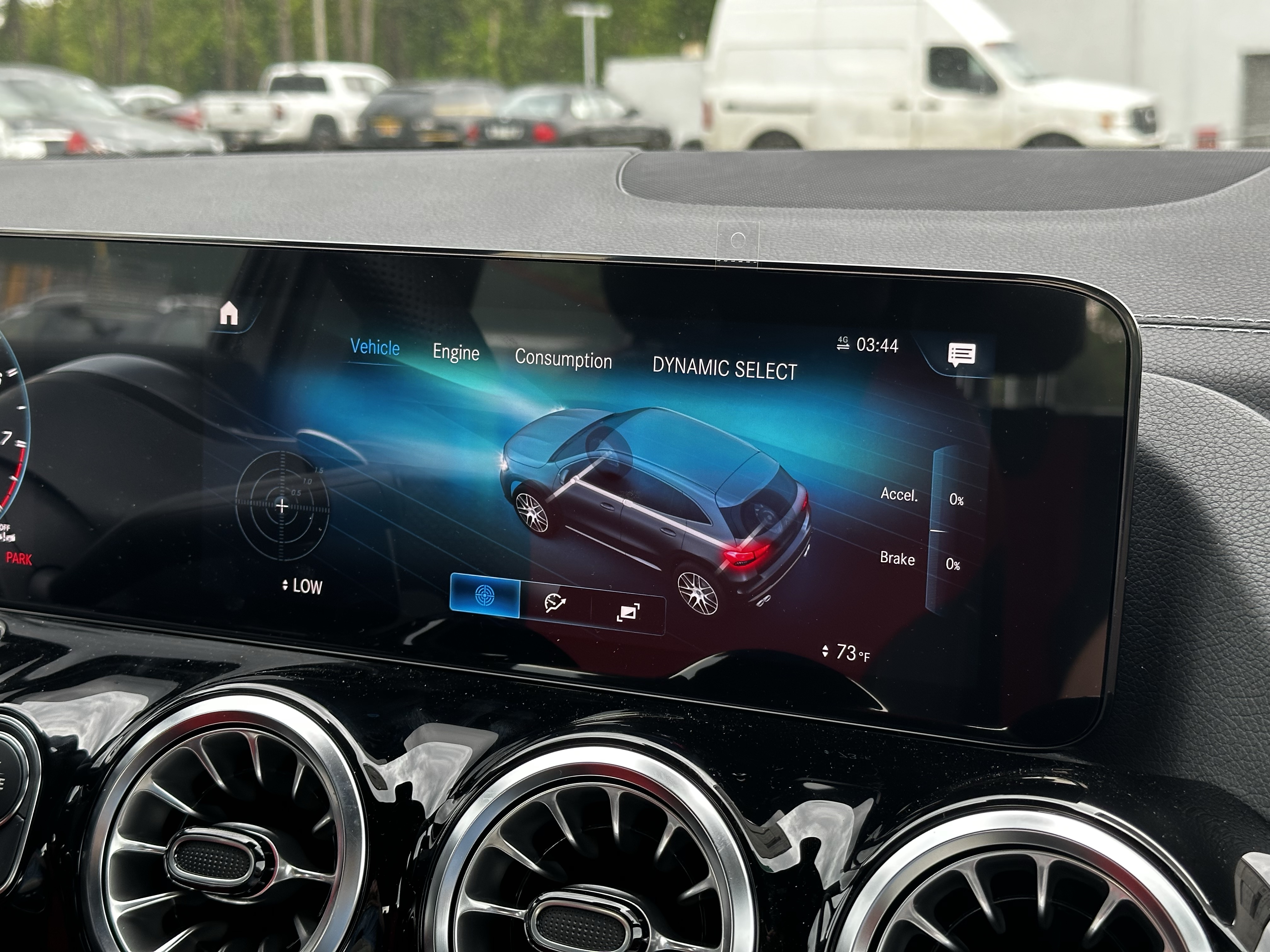 Other stuff you get with the GLA 45 includes heated seats, wireless CarPlay and Auto connectivity, ambient lighting, dual-zone climate controls, rain-sensing wipers, BLIS monitoring, adaptive high beam headlights, an illuminated star (subtle, right), and an AMG Drive Unit.