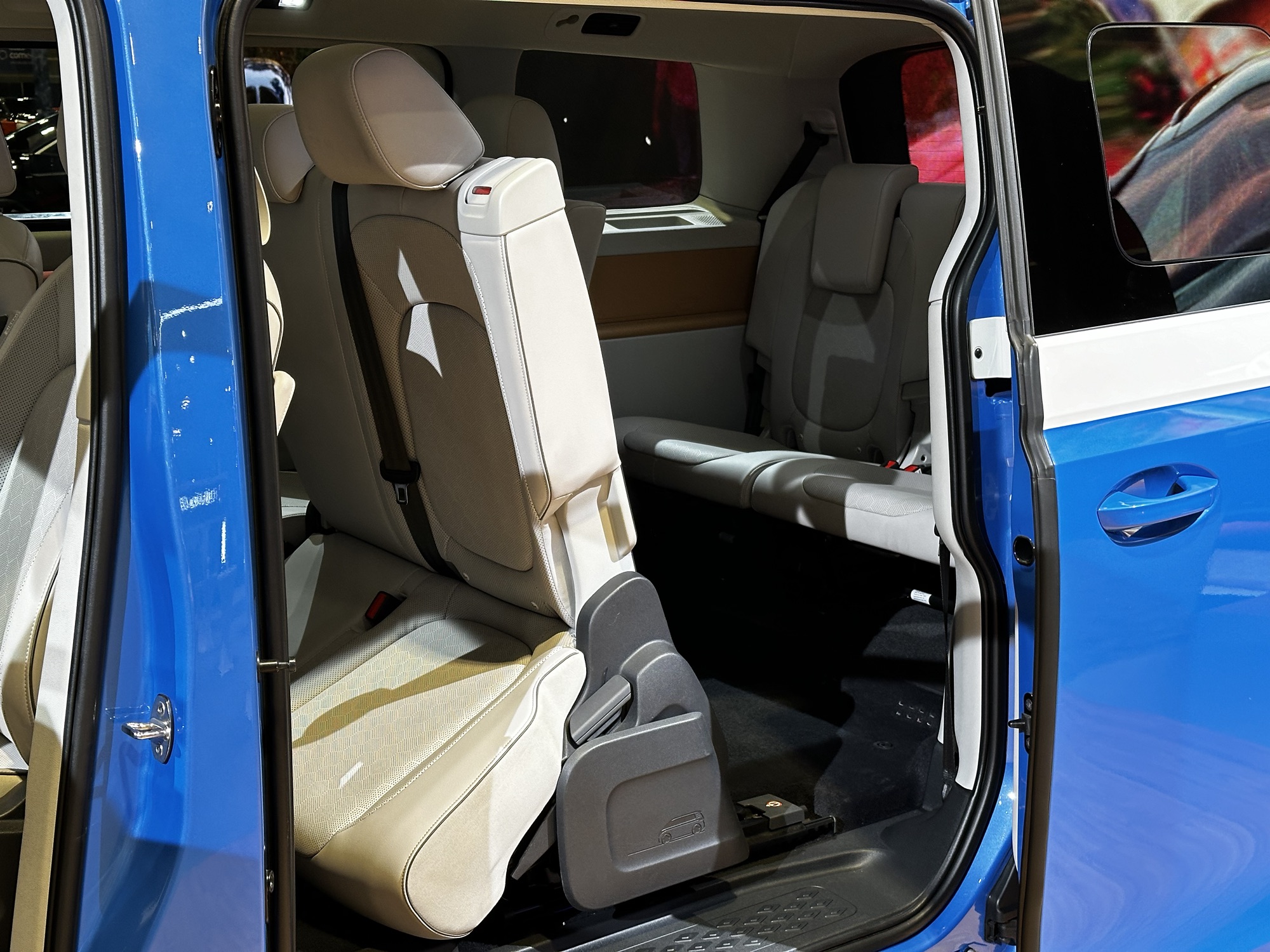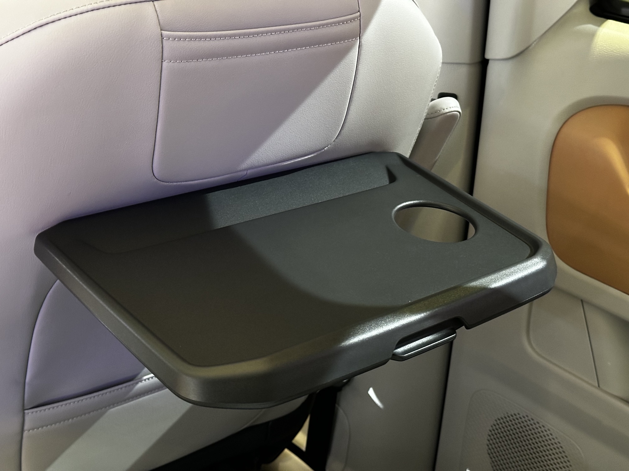 This thing is so cool. Sorry, my train of thought broke through for a moment. Anyway, the interior of the ID. Buzz is so extra. Not in a Mercedes EQS 580 extra, but like a “how many gimmicks can you fit in here?” extra. For starters, there are picnic tables attached to the rear seats! That’s fun. There are also plenty of fun and funky patterns on the door sills and a strange, yet complimenting white and orange interior color pallet. Rear seat legroom is solid, while the 3rd-row struggles, so if you’re short, know your place.